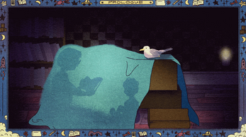 I LOVE the borders you've added to each scene. It's clear that they must have taken extra work to complete, but they help characterize each scene and also contain each moment in time as the player switches back and forth between the story and the frame narrative. Plus they have that Ivan Bilibin, storybook, Comet's Nine Lives by Jan Brett je n'est ce quoi.